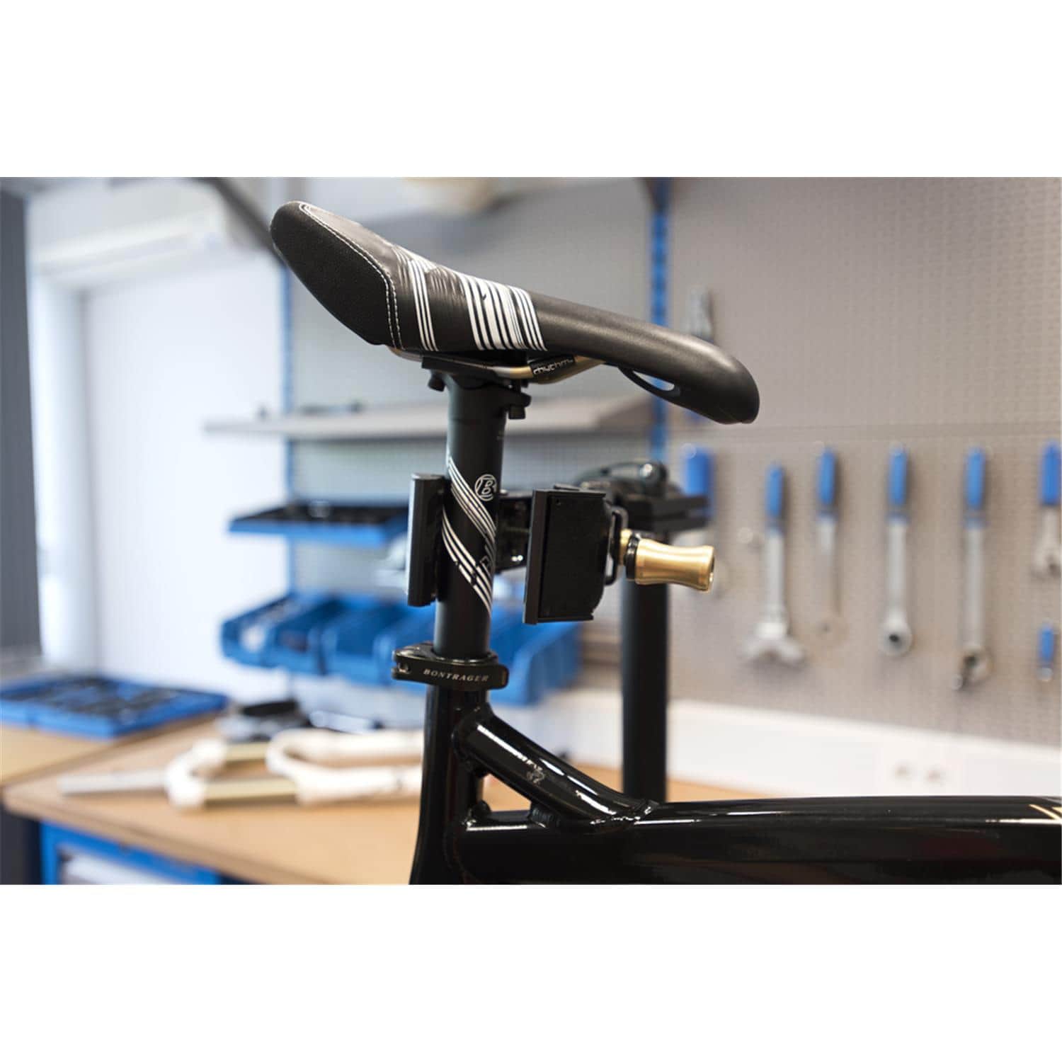 - מערכת שחרור מהיר מאפשרת למכונאי ללחוץ על הלסתות ביד, ובשלב זה מהדק כבר אוחז בעמוד המושב של מסגרת בכוח מספיק כדי להחזיק את האופניים במקומם. סובב את הידית ומתח נוסף מופעל על הלסתות כדי להבטיח אחיזה יציבה.